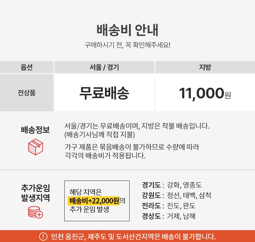 | 기사님 방문 시 제품에 이상이 없을 경우, 왕복 배송비는 고객 부담입니다. | |