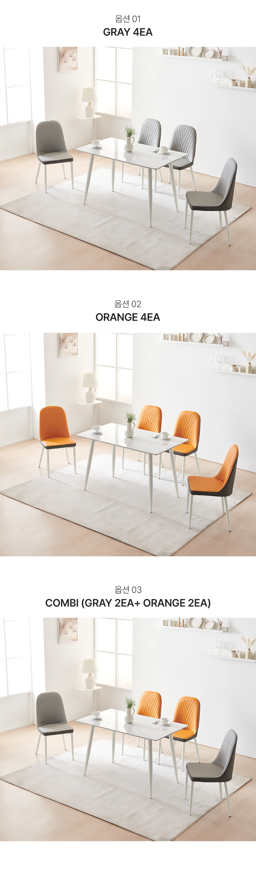 색상 식탁상판: 화이트 / 식탁&의자프레임: 블랙,화이트 / 의자좌방석: 오렌지,그레이